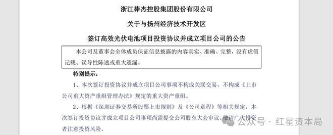 公告显示,棒杰股份于2022年底决定大举进军光伏产业。2022年12月,棒杰股份董事会审议通过议案,同意与扬州经济技术开发区管委会签署《高效光伏电池项目投资协议》。