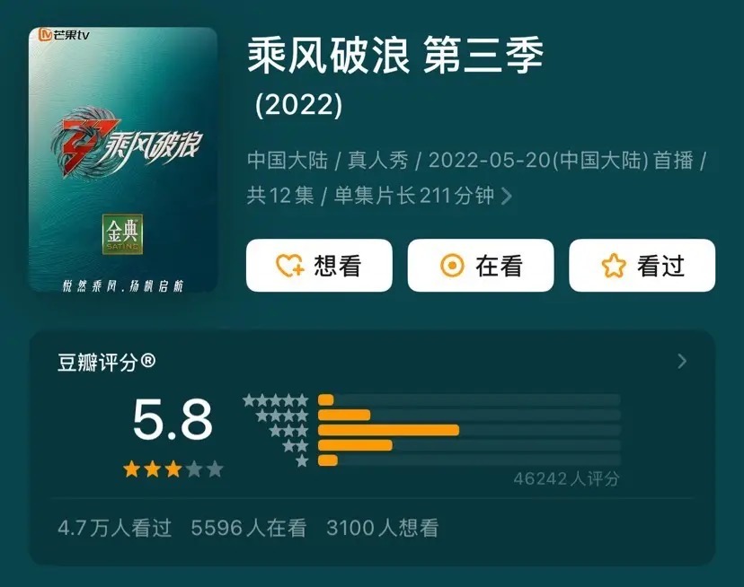 这几乎是最不被看好的一届“浪姐”。最直接的体现是招商,节目总冠名从连续赞助五年的知名奶饮品牌换成了网贷平台。从综艺行业整体招商环境看,这并非《浪姐7》最大问题。资深综艺导演小P表示,近年综艺招商大幅缩水,很多有高回报需求的品牌客户更倾向投资剧集或短剧,“因为能直接看到现金流,觉得更有保障”。总冠名降级并非《浪姐》独有,小P透露,某个办了十几年的大IP综艺,招商同样不理想,“以前这么大、成熟的老牌IP,总冠名会有很多品牌争抢,今年却只有唯一一家。现在招商确实不容易”。《浪姐7》更大的危机在于阵容,节目办到第七年,此前六季已“消耗”180多位30+女明星,找嘉宾难度可想而知。开播前,网传名单中有张曼玉、陈慧琳、林志玲等具国民度和话题性的女明星,结果一个都没请来。正式名单官宣后,《乘风2026》被网友调侃是“最糊”的一届浪姐。这种评价并非毫无道理,“浪姐”IP呈现出明显的疲态。翻看六届“浪姐”的豆瓣数据,信号已然清晰。2020年,在宣传不足的情况下,《乘风破浪的姐姐》工作日中午空降播出,最终超17.2万人在豆瓣打出6.8分。开播即爆款,出道即巅峰,17万人、6.8分是“浪姐IP”至今最好成绩。此后5季,“浪姐”口碑再未及格。第三季,节目名去掉“姐姐”,改为《乘风破浪》,靠王心凌的情怀杀和CP叙事再度破圈,但打分人数滑落至4万规模,这种从“社会话题”向“粉丝圈层”的收缩,在后续几季中愈发明显。节目组一直在努力求变,第四季再次更名,“破浪”也被拿掉,主题从“关注30+女性成长”拓宽至“国际女性文化交流”,嘉宾人数一度增加到36位。然而,这种“扩容”似乎未能止住评分与热度的下滑趋势。到了《乘风2025》,豆瓣打分人数萎缩至1.5万左右,为历届最低。《浪姐7》还能做什么?