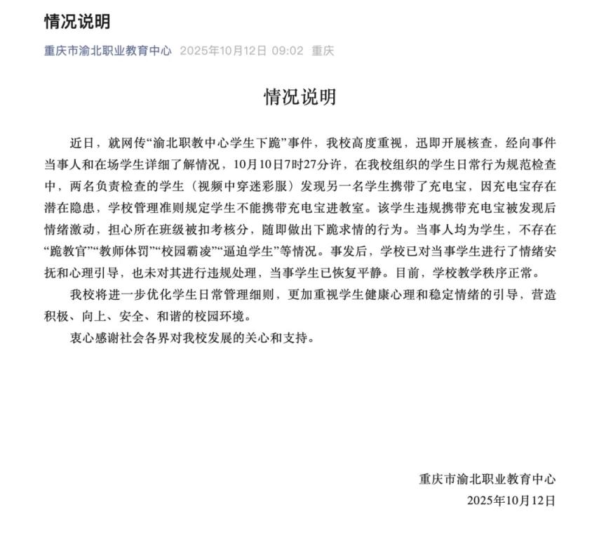 当事人均为学生,不存在“跪教官”“教师体罚”“校园霸凌”“逼迫学生”等情况。事发后,学校已对当事学生进行了情绪安抚和心理引导,也未对其进行违规处理,当事学生已恢复平静。目前,学校教学秩序正常。